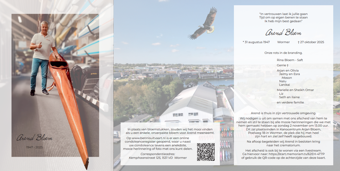 We nodigen u uit om samen met ons afscheid van hem te nemen en stil te staan bij alle mooie herinneringen die we met hem gemaakt hebben op zondag 2 november om 13.00 uur. Dit zal plaatsvinden in Kanocentrum Arjan Bloem, Poelweg 1B in Wormer. We vragen u niet eerder dan 12.00 uur bij het Kanocentrum te verzamelen, zodat wij in alle rust de voorbereidingen kunnen treffen.